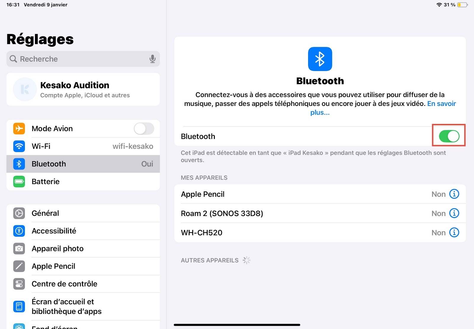 Pour vérifier que vos appareils sont encore connecté il vous suffit d’aller dans les réglages —> accessibilité —> appareil auditif —> regarder si le nom de vos appareils apparaît et qu’il y a bien écrit « connecté »