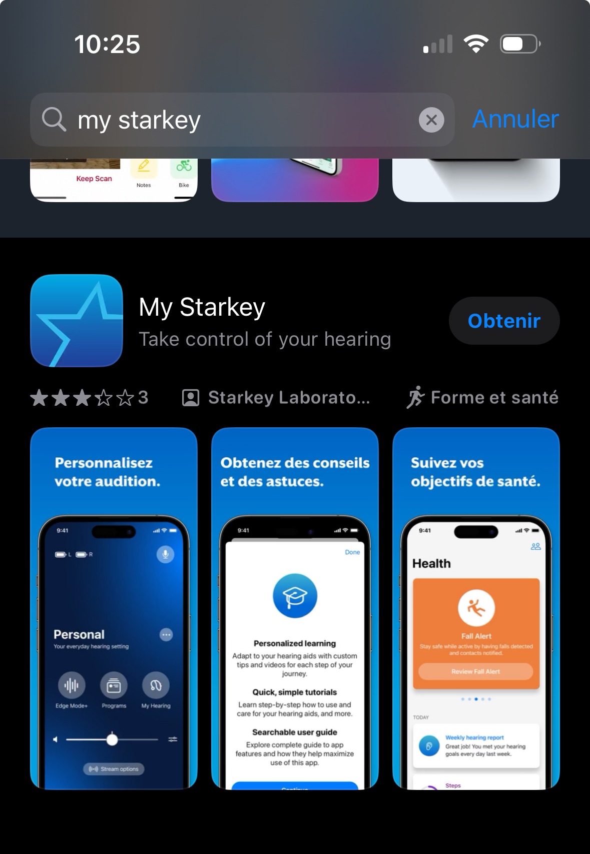→ Patientez quelques secondes, puis une fois l’installation terminée, vous pouvez retrouver l’application en recherchant dans la barre de recherche “My Starkey”