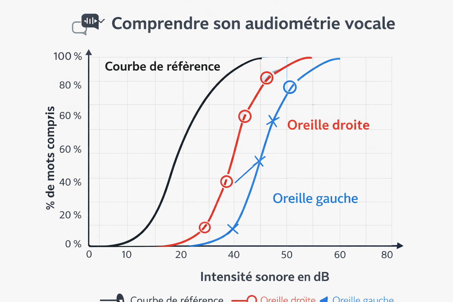 🔵La courbe de l’oreille gauche (en bleu) : elle montre la compréhension vocale de l’oreille gauche selon le même principe.